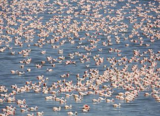 Hàng triệu hồng hạc lội giữa hồ nước hóa đá động...